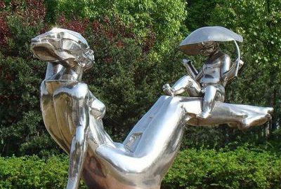純銅母子雕塑一米六左右,瘦瘦的,扎著個(gè)馬尾。鑄造母子雕塑找了個(gè)我右手邊的另外一排的位置坐下后,就把女的抱著坐在他大腿上,一邊玩著她的馬尾,一邊和她輕輕地說說笑笑。而純銅母子雕塑則時(shí)不時(shí)摸摸男人的頭,或笑或嗔。母子雕塑用右眼余光乜著他們,暗暗感嘆真恩愛。